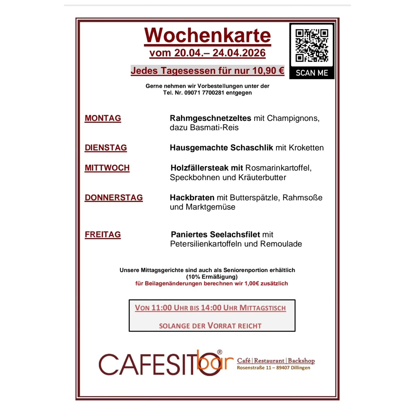 | Gundelfingen Hauptstraße 56 jeweils mit kleinem Salat 8,30 € (mit Salatteller 9,80 €) | Schweinebraten mit Kartoffelpüree 8,30 € vegetarisch: Gebackene Kartoffelscheiben, Rucola- Käsemousse gratiniert 8,30 € | Schaschlik Topf mit Butterreis 8,30 € vegetarisch : Risotto, Paprika, Käse 8,30 € | Pikantes ANGUS Gulasch mit hausgemachten Spätzle 8,30 € vegetarisch: Gemüse-Schupfnudeln 8,30 € | Krautwickerl, Rahmsoße, Kartoffeln 8,30 € vegetarisch: Schwammerlgulasch, Kräuterrahm, Semmelknödeln 8,30 € | Champignon-Rahmschnitzel, Kartoffelkroketten 8,30 € vegetarisch: Gemüse-Teller, Spiegelei, Kartoffeln 8,30 € | Ø 8,30 € | ||